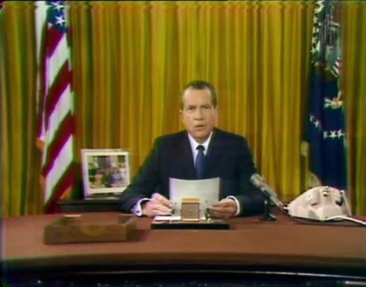 - August 9, 1974 – With impeachment proceedings underway against him for the Watergate Affair, President Richard M. Nixon resigns, becoming the first president in American history to do so.