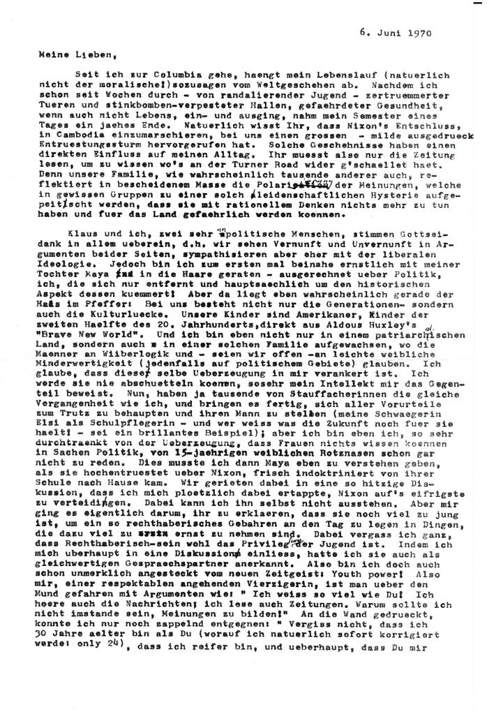 Since I’ve been going to Columbia University the story of my life is being written by world events, so to speak. After I had been endangering my health, if not my life, going to the university campus for weeks – past and through rioting youth, smashed doors, and stink bomb-polluted lecture halls – suddenly my semester came to an abrupt end. Of course, you know that Nixon’s decision to invade Cambodia [secret bombings – no longer so secret] has caused a great storm of indignation in our country. Such international events have a direct impact on my everyday home life. So, you only have to read the newspaper to know what’s happening here [at home] on Turner Road. Even our little family (probably like thousands of others) reflects the polarization of political thought, which in certain groups are whipped up into such a passionate hysteria that they no longer have anything to do with rational thinking. This indeed has become quite dangerous for the entire country.