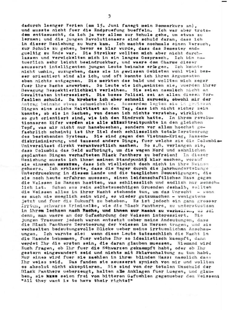 But I am disappointed because I went to university to learn something, and the young revolutionaries are to blame for the fact that I have been cheated out of some of that time. Towards this end, I tried to go to school again before it became clear (and official) that the semester was really, truly over. But the strikers did not want to let me through and engaged me in a long conversation. I am of course very easily impressionable, and almost succumbed to the charms of these extremely intelligent young people. I can’t help but admit that in certain areas they are indeed better oriented than I – and I often could not counter their arguments. They soon noticed this and wanted to recruit me to their side. People like me, they said, would give respect to their movement. They are not interested in acts of violence, they told me. The evil police are to blame for these incidents, the students explained. Although the offer to join their ranks flattered me, I quickly recovered. While their confidence swayed me, I could see that they had naiveté as to how the world works. I began to doubt that they were really so well-oriented in matters that I feel I do not understand. In their revolutionary zeal, they throw all points of contention into the same pot, which seems to me not only to be outrageous but above all highly dangerous; after all, their goal is the total destruction of the existing system. They are against the Vietnam War, sexual discrimination, racial discrimination, and a thousand other things for which they hold Columbia University directly responsible. For example, they demand that Columbia raise money to free the Black Panthers arrested for murder and other awful things! In this context, I had to make my point of view clear to them, so they would realize that I might not belong in their ranks after all. I explained that the centuries of oppression in this country and the humiliation that the negros still have to experience today elicit a passionate hatred of the whites. This is in the end only human. For purely selfish reasons, therefore, the whites should do everything in their power to remedy the injustice. Even if it will never be possible to make amends, the attempt should at least be made to fix it – if not for today then for the future.