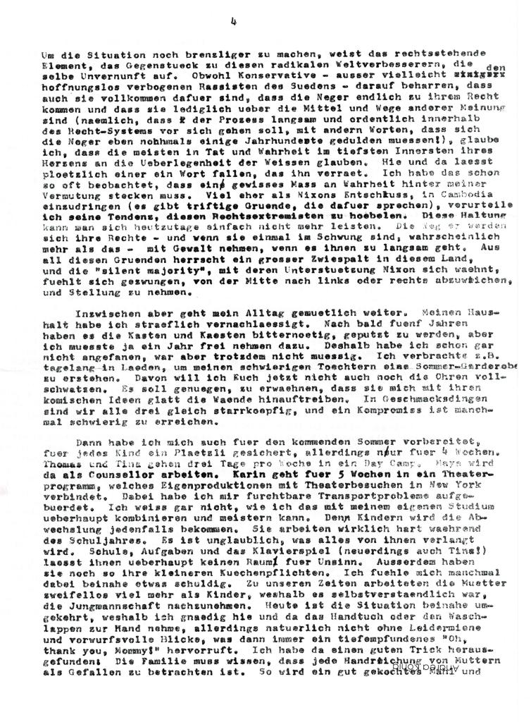 Editor’s note: In June 1970 – 50 years ago today – Edith, my mother, was 39 years old and her children ranged in age from 15 to 6 years old. My parents moved to the US in the late 1950’s, eventually settling in the New York area. For many years my mother drafted long letters home to our relatives in Switzerland attempting to explain her life in the New World. Of the dozens of letters written only a handful survive, so I took the time to translate this one from the original German. It was written one month after the Kent State shootings and two years before the withdrawal of the majority of US troops from Vietnam.