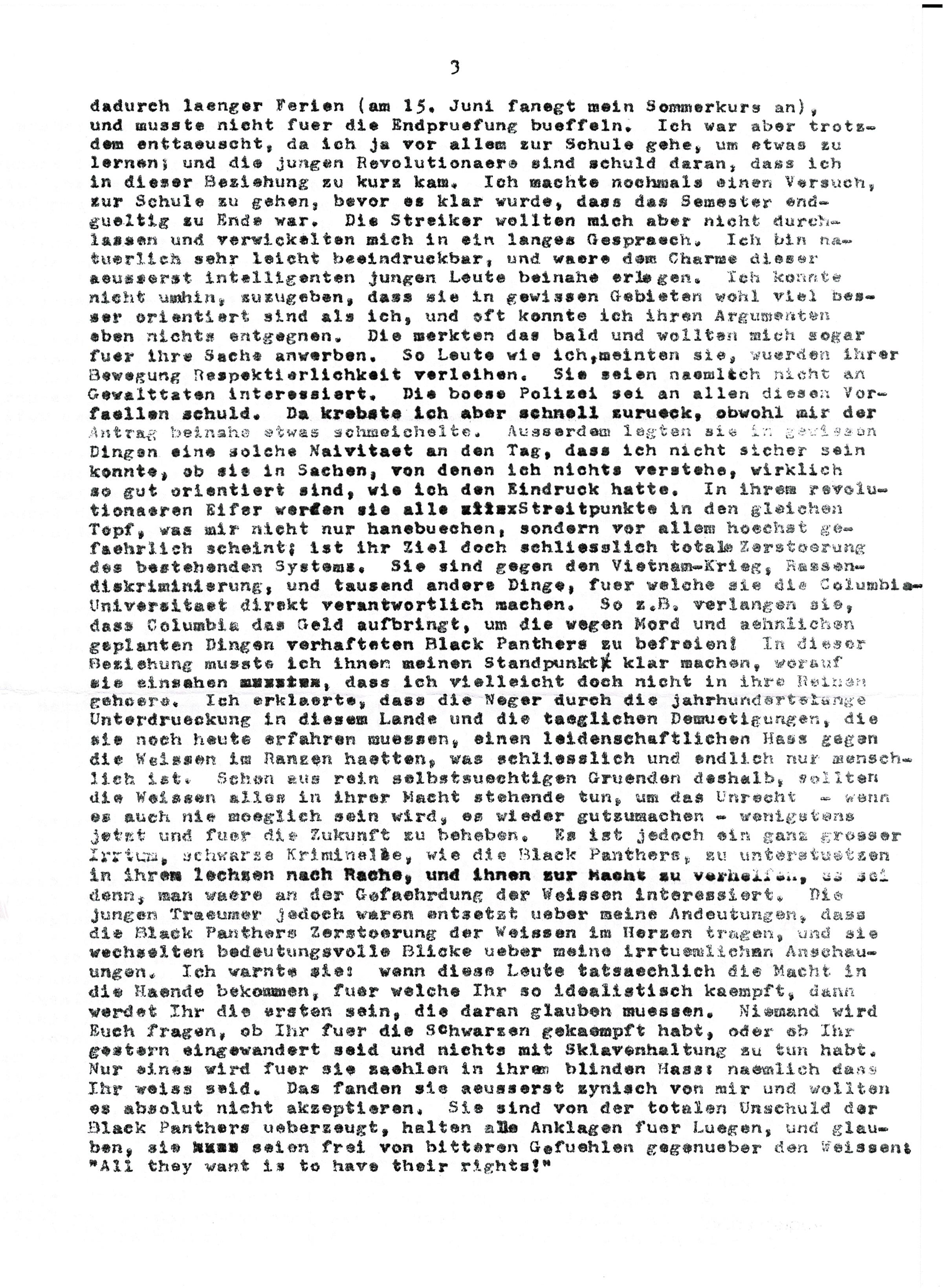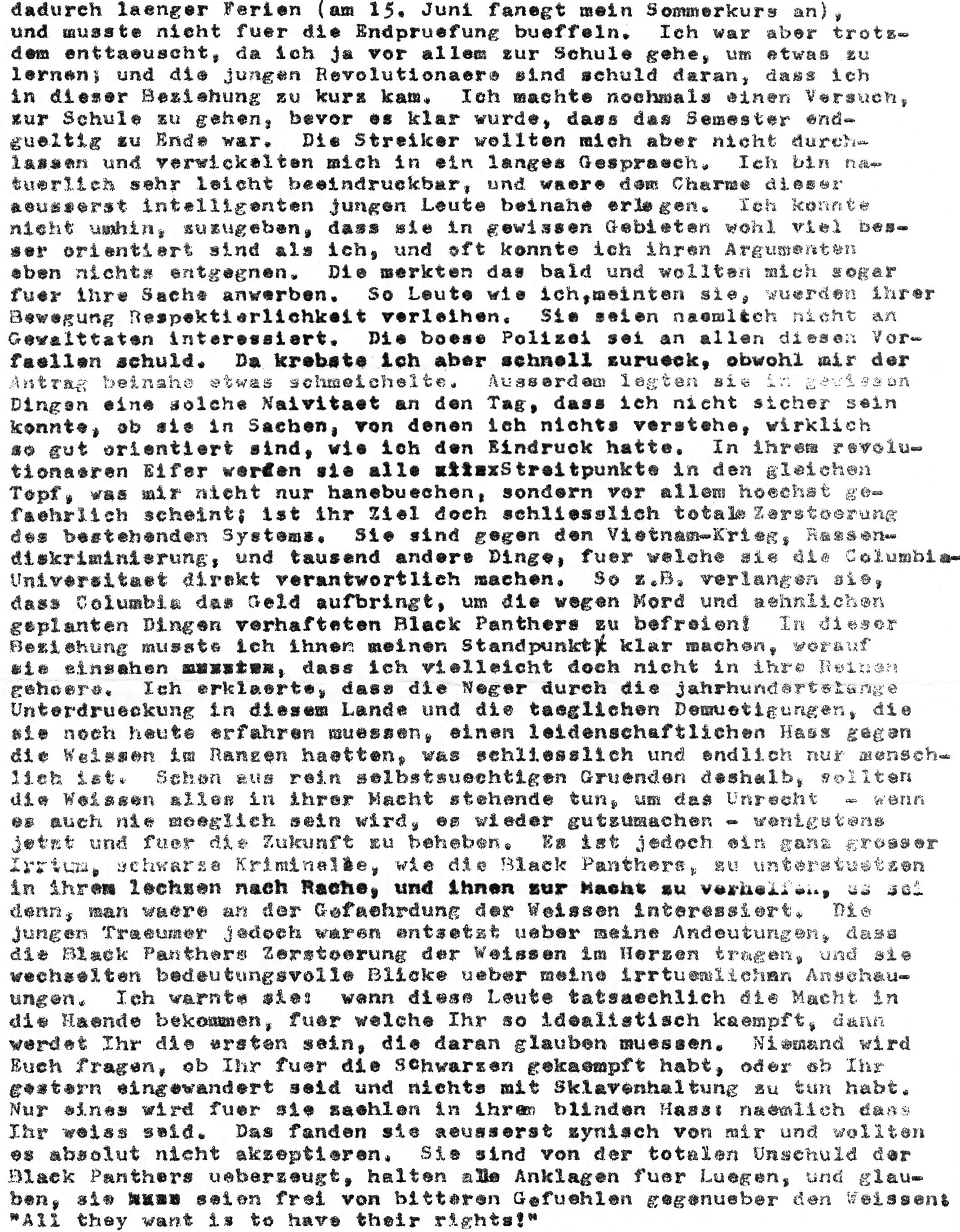 But I am disappointed because I went to university to learn something, and the young revolutionaries are to blame for the fact that I have been cheated out of some of that time. Towards this end, I tried to go to school again before it became clear (and official) that the semester was really, truly over. But the strikers did not want to let me through and engaged me in a long conversation. I am of course very easily impressionable, and almost succumbed to the charms of these extremely intelligent young people. I can’t help but admit that in certain areas they are indeed better oriented than I – and I often could not counter their arguments. They soon noticed this and wanted to recruit me to their side. People like me, they said, would give respect to their movement. They are not interested in acts of violence, they told me. The evil police are to blame for these incidents, the students explained. Although the offer to join their ranks flattered me, I quickly recovered. While their confidence swayed me, I could see that they had naiveté as to how the world works. I began to doubt that they were really so well-oriented in matters that I feel I do not understand. In their revolutionary zeal, they throw all points of contention into the same pot, which seems to me not only to be outrageous but above all highly dangerous; after all, their goal is the total destruction of the existing system. They are against the Vietnam War, sexual discrimination, racial discrimination, and a thousand other things for which they hold Columbia University directly responsible. For example, they demand that Columbia raise money to free the Black Panthers arrested for murder and other awful things! In this context, I had to make my point of view clear to them, so they would realize that I might not belong in their ranks after all. I explained that the centuries of oppression in this country and the humiliation that the negros still have to experience today elicit a passionate hatred of the whites. This is in the end only human. For purely selfish reasons, therefore, the whites should do everything in their power to remedy the injustice. Even if it will never be possible to make amends, the attempt should at least be made to fix it – if not for today then for the future.