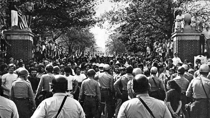 Kent State: On April 30, 1970, President Nixon announced the expansion of the Vietnam War into Cambodia. On May 1, protests on some 900 college campuses and in cities throughout the U.S. began. The strike increased significantly after the shooting of students at Kent State University by National Guardsmen on May 4. While many violent incidents occurred during the protests, they were, for the most part, peaceful. Due to a resurgence of anti-war protests on campuses (last major protests were in 1968), final exams were curtailed at Columbia and many universities throughout the US.