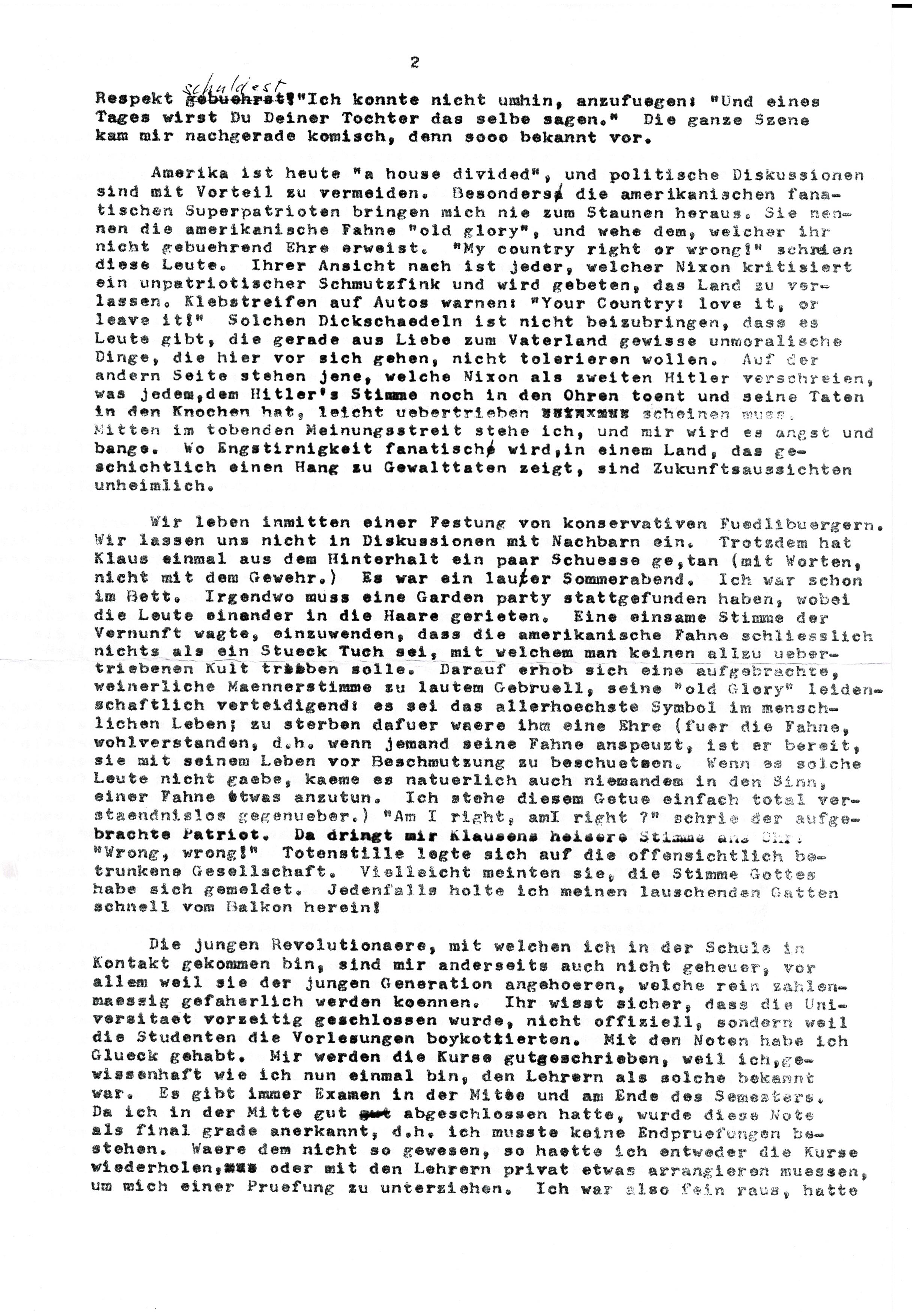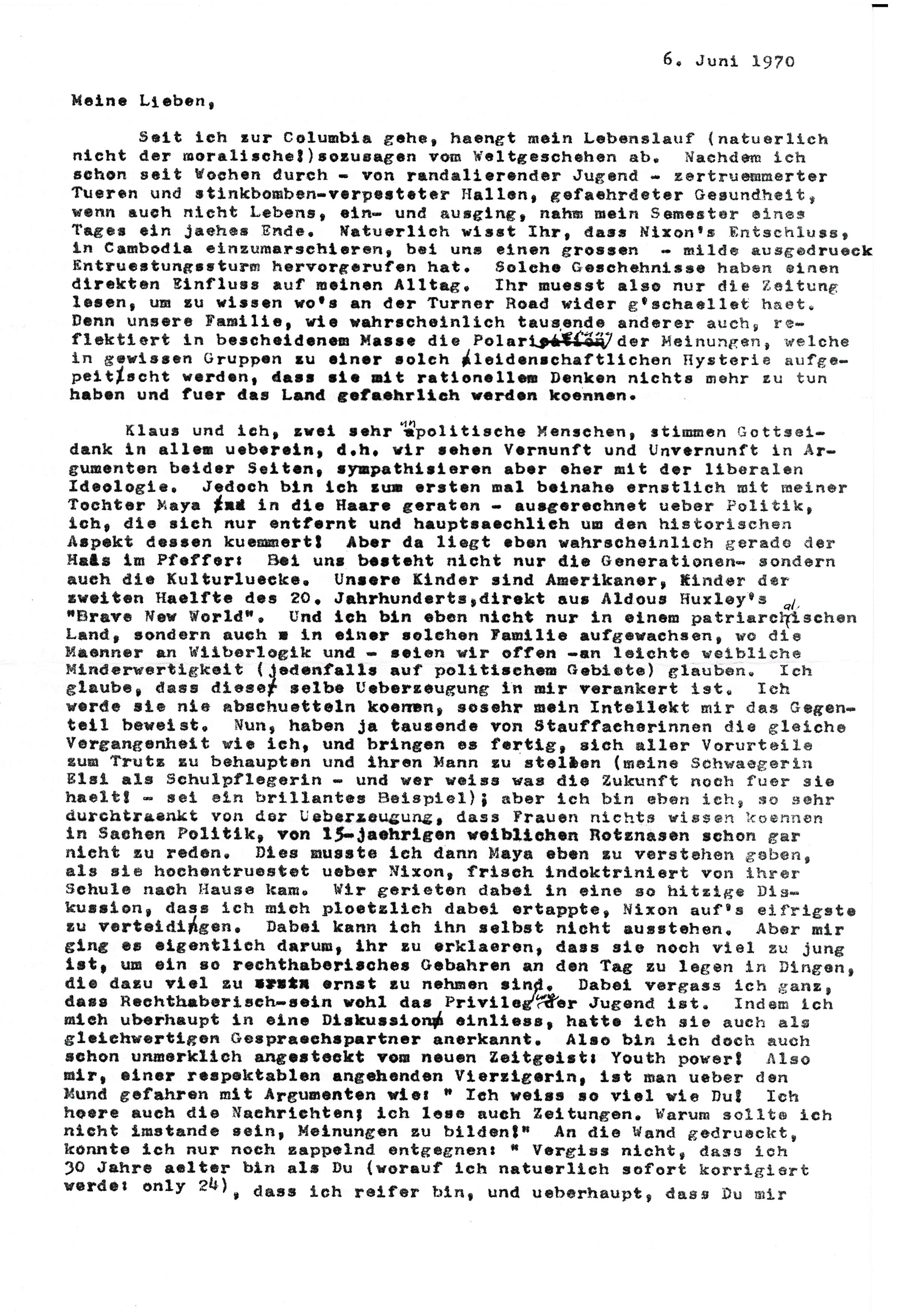 Since I’ve been going to Columbia University the story of my life is being written by world events, so to speak. After I had been endangering my health, if not my life, going to the university campus for weeks – past and through rioting youth, smashed doors, and stink bomb-polluted lecture halls – suddenly my semester came to an abrupt end. Of course, you know that Nixon’s decision to invade Cambodia [secret bombings – no longer so secret] has caused a great storm of indignation in our country. Such international events have a direct impact on my everyday home life. So, you only have to read the newspaper to know what’s happening here [at home] on Turner Road. Even our little family (probably like thousands of others) reflects the polarization of political thought, which in certain groups are whipped up into such a passionate hysteria that they no longer have anything to do with rational thinking. This indeed has become quite dangerous for the entire country.