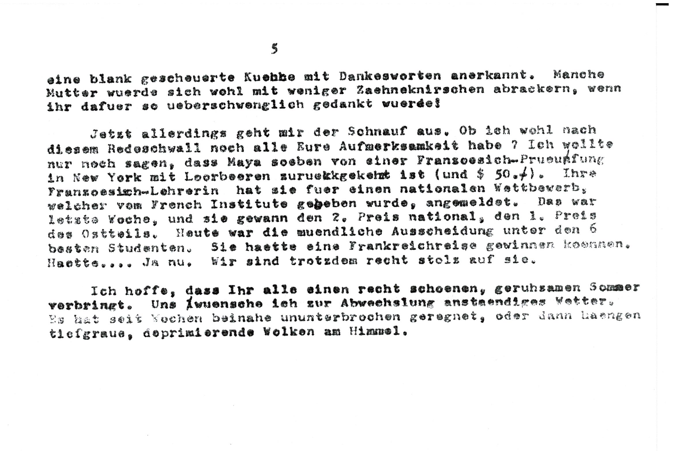 Attire arranged, I then had to prepare the family for the coming summer, securing a place for each child. Thomas and Tina will go three days per week for a month of Day Camp [Rockland Foundation, later renamed RoCA.] Maya will work there as a junior counselor. Karin goes to a five-week theater program that produces their own in-house productions followed by theater visits in New York City. In making these clever arrangements I have imposed a terrible transport problem on myself. I don’t know how to combine and master this with my own studies at all. In any case, the children will get the variety they need. They really do work hard during the school year. It is unbelievable what is required of them: school, homework assignments, and playing the piano (recently also Tina!) leaves them no room for nonsense at all. In addition, they have their smaller kitchen duties. Sometimes I almost feel a little guilty about it. In our time, mothers undoubtedly worked more than their children, so it was a matter of course to enlist the young ones to help. Today the situation is almost reversed, which is why I graciously pick up a towel or a washcloth now and then – but not without painful and reproachful looks to emphasize the great imposition. That usually works as I am almost always met with a heartfelt, “Oh, thank you, Mommy!” I have found that a good trick: the family must know that every assistance from their mother is to be regarded as a great favor. In this way, a well-cooked meal and cleanly scrubbed kitchen are recognized with words of thanks. Other mothers would probably struggle with less gnashing of their teeth [weniger Zähneknirschen abrackern] if they were thanked so effusively!