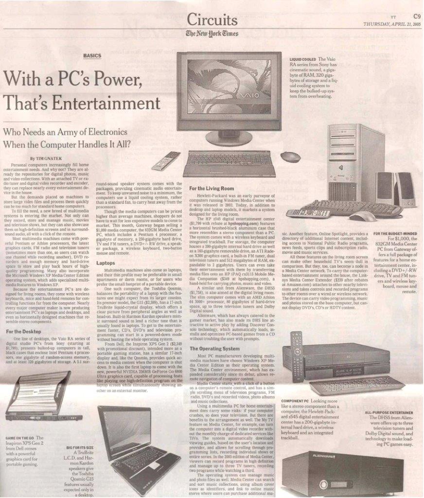 Circuits section cover story. The New York Times looks at the new crop of entertainment PCs coming out in Spring 2005.
