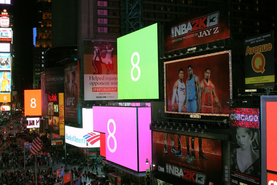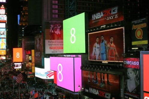 Times Square lights up in Windows 8 colors at midnight, last night.