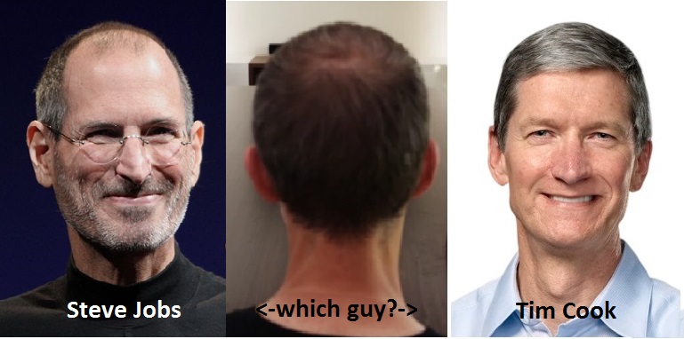 Pictures speak louder than words. The man in the middle was identified in the video as “T” – indicating he was supposed to be Tim Cook. You decide. On the left is a photo of Jobs. On the right is a photo of the current Apple CEO, Cook. The back of whose head is in the middle?