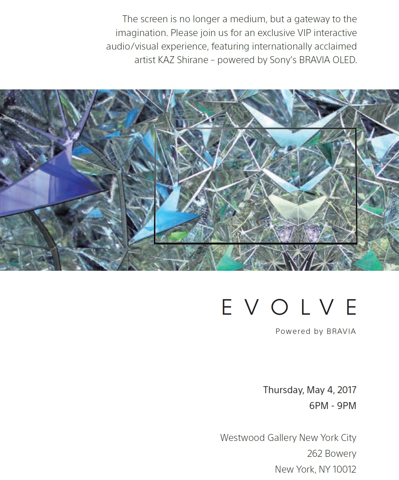 Link to the full press release: https://www.sony.com/en_us/SCA/company-news/press-releases/sony-electronics/2017/sony-electronics-presents-evolve-installation-by-kaz-shirane-powered-by-bravia-oled-may-57-at-westwood-gallery-nyc.html